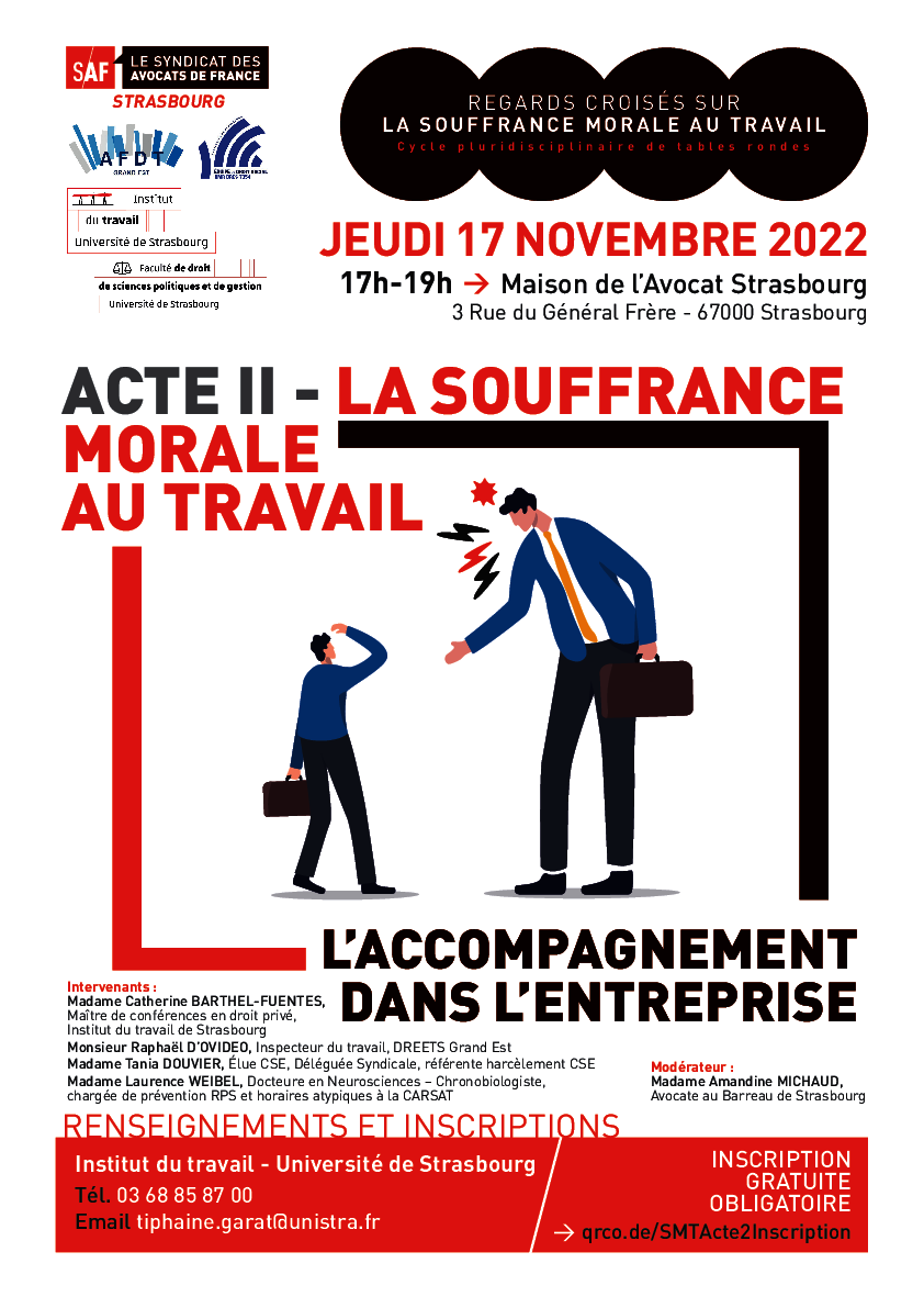 La problématique de l’accompagnement du salarié, abordée tant dans sa dimension individuelle que collective (outils juridiques pouvant être mobilisés dans l’entreprise, acteurs internes et externes à l’entreprise pouvant être sollicités par le salarié, prise en charge collective des RPS dans l’entreprise, etc.), sera éclairée par les analyses et retours d’expérience de différents experts et professionnels : universitaire, inspecteur du travail, représentant du personnel, spécialiste des RPS au sein de la CARSAT