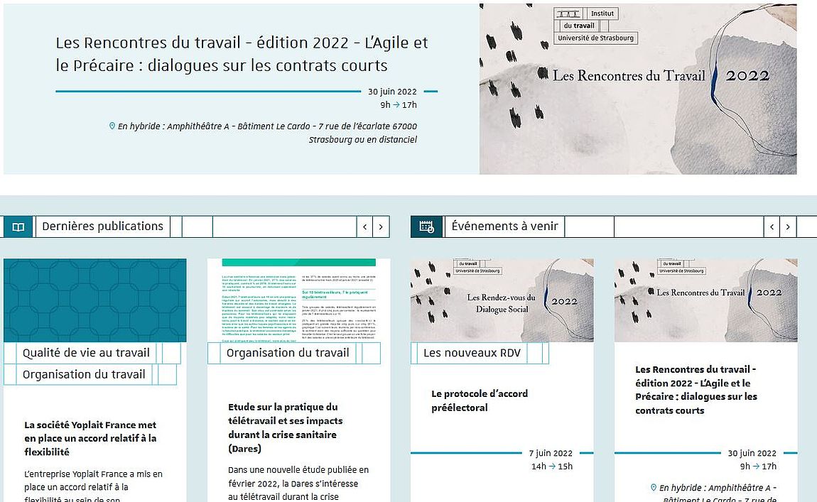 Nous sommes également heureux de vous inviter aux prochaines Rencontres du travail 2022 « L'Agile et le Précaire : dialogues sur les contrats courts ». Le programme est quasi finalisé et nous vous le présentons dans cette lettre. Qui sont les contrats courts ? Quels sont les cas de recours, les modalités et motifs d’utilisation ? Quelles sont les conséquences de l’utilisation des contrats courts sur la relation d’emploi, les parcours de vie et professionnels des salariés, dans la construction des collectifs de travail ? Quelles politiques publiques de lutte contre l’utilisation abusive des contrats courts ? Des experts et acteurs socio-économiques, des représentants de l'Etat et des universitaires viendront débattre de ces questions lors de l’édition 2022 des Rencontres du travail organisées le mercredi 30 juin en format hybride.