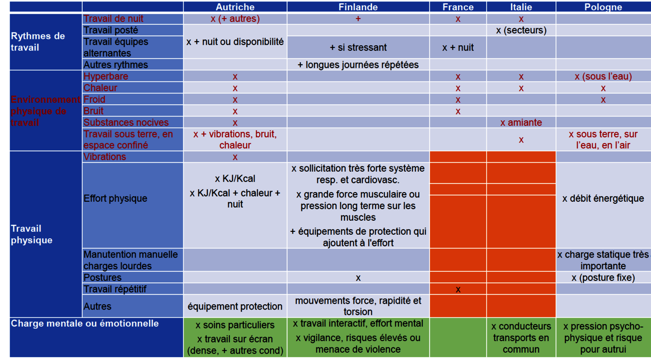 - L’analyse des 3 dimensions structurantes du régime de définition de la pénibilité : mode d’élaboration (loi/négociation collective ; niveau de définition (national / par branche ou entreprise ; champ de la retraite / champ santé sécurité au travail / les deux simultanément)