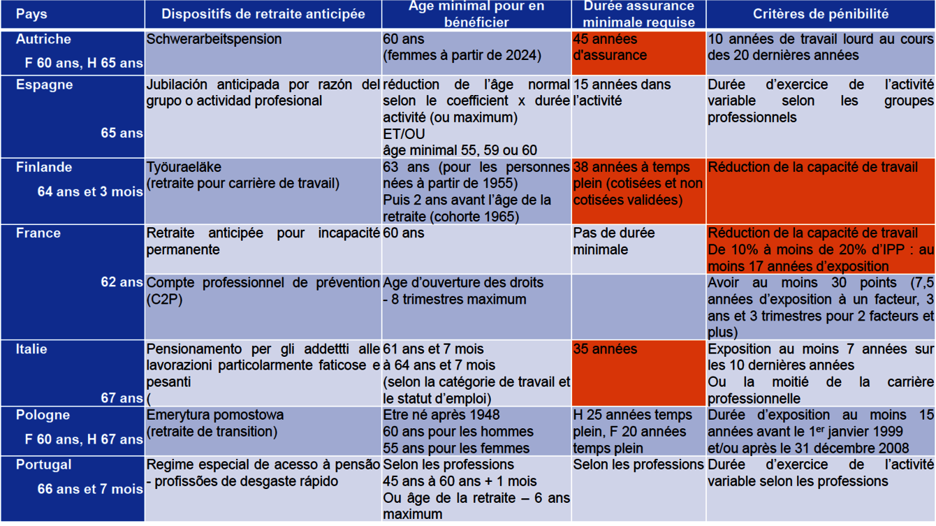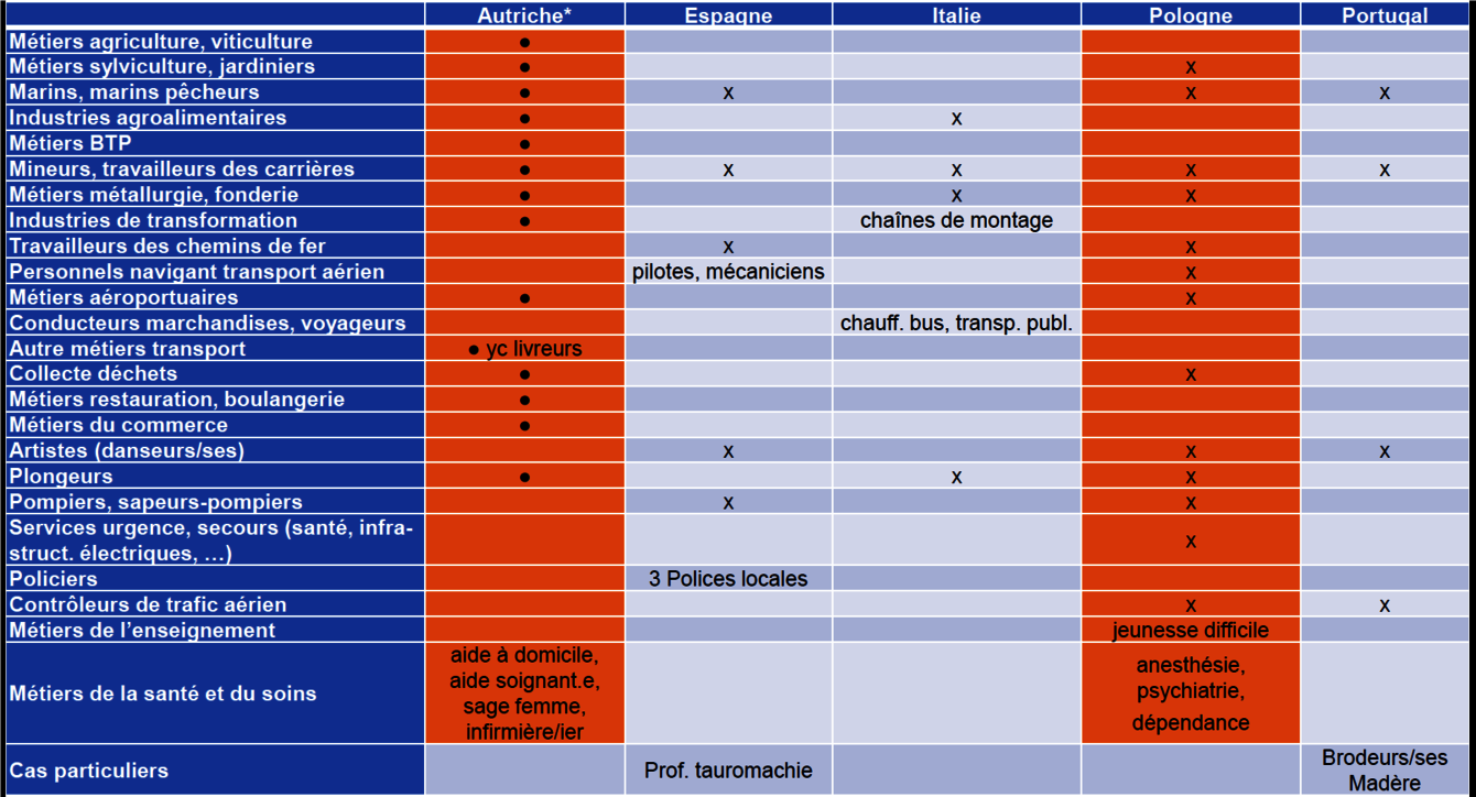 Question 6 _France Stratégie a défini les 20 métiers pour lesquels la sortie précoce avant l'âge de la retraite est la plus importante pour raisons de santé (en moyenne 57 ans). Trois métiers sont concernés par 30% de sortie précoce : les ouvriers peu qualifiés de la manutention, les ouvriers peu qualifiés du second œuvre du bâtiment, ainsi que les caissiers-employés de libre-service. Ces métiers apparaissent-ils dans les dispositifs de départ anticipé de certains pays européens ?